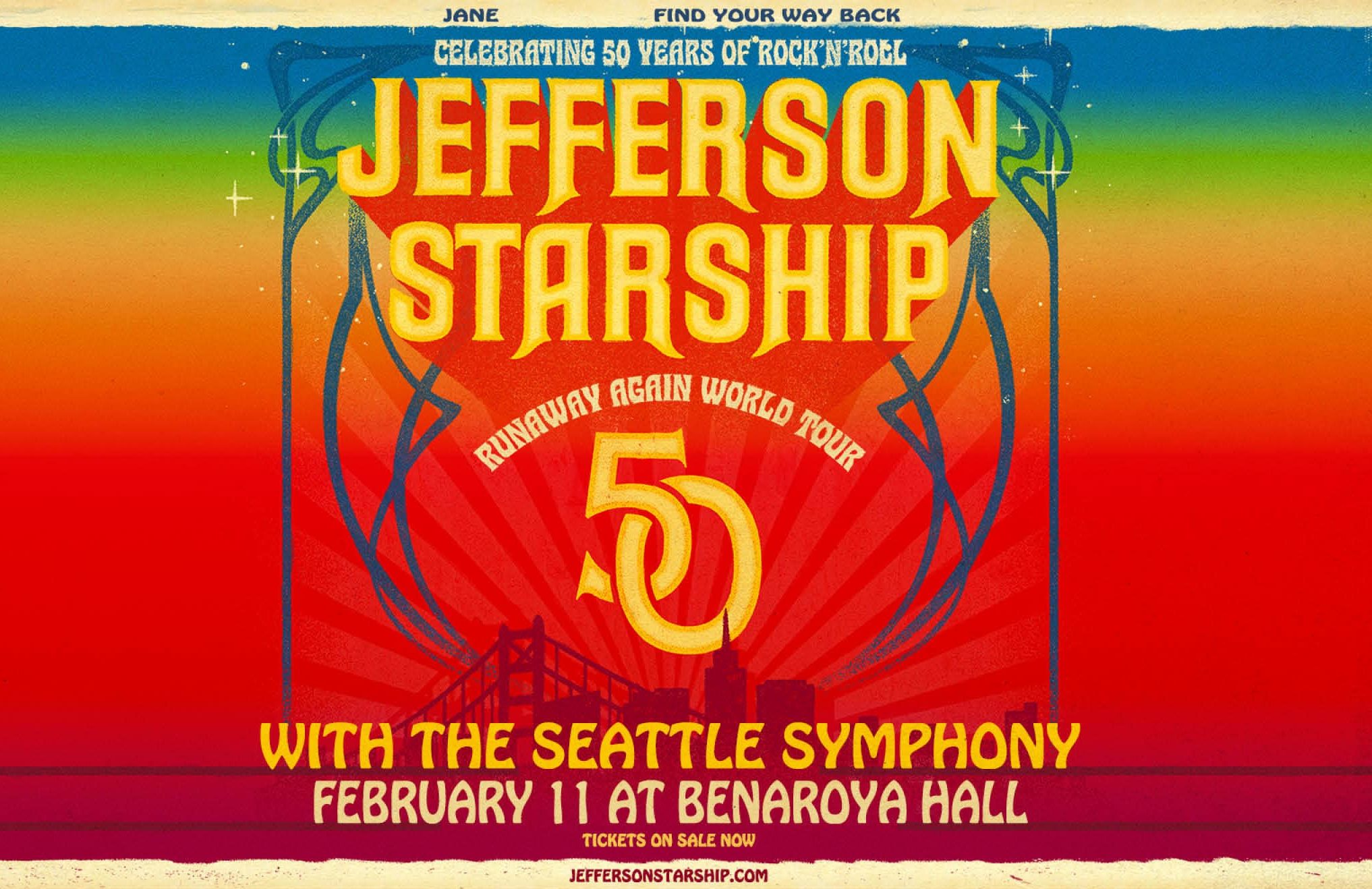 Jefferson Starship is one of the most successful arena rock bands of the 1970s and 1980s, earning 3 platinum and 8 gold records, as well as numerous Top 40 Billboard singles. On the Seattle stop of their 50th Anniversary Tour, they join forces with the Seattle Symphony and conductor Sarah Hicks for an unforgettable evening of nonstop hits.